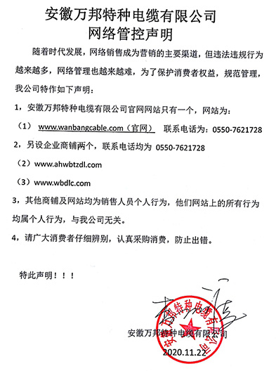 鄭重聲明:安徽萬邦特種電纜有限公司官方網站為:www_wanbangcable_com.yazhigao.com,除此之外無任何子網站或合作網站,其余均為假冒偽劣。電話:0550-7621728 13485756353 地 址:安徽省天長市滁州高新技術產業開發區經四路29號